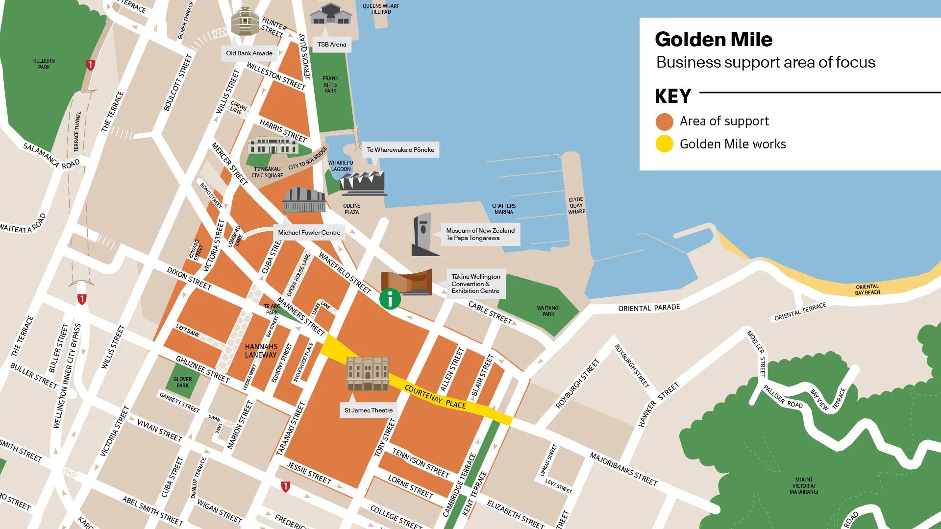All support resources are available to business owners in the areas affected by the Golden Mile works. The following map shows the area of focus for business support in Courtenay Place and Te Ngākau Square. See the support map here.